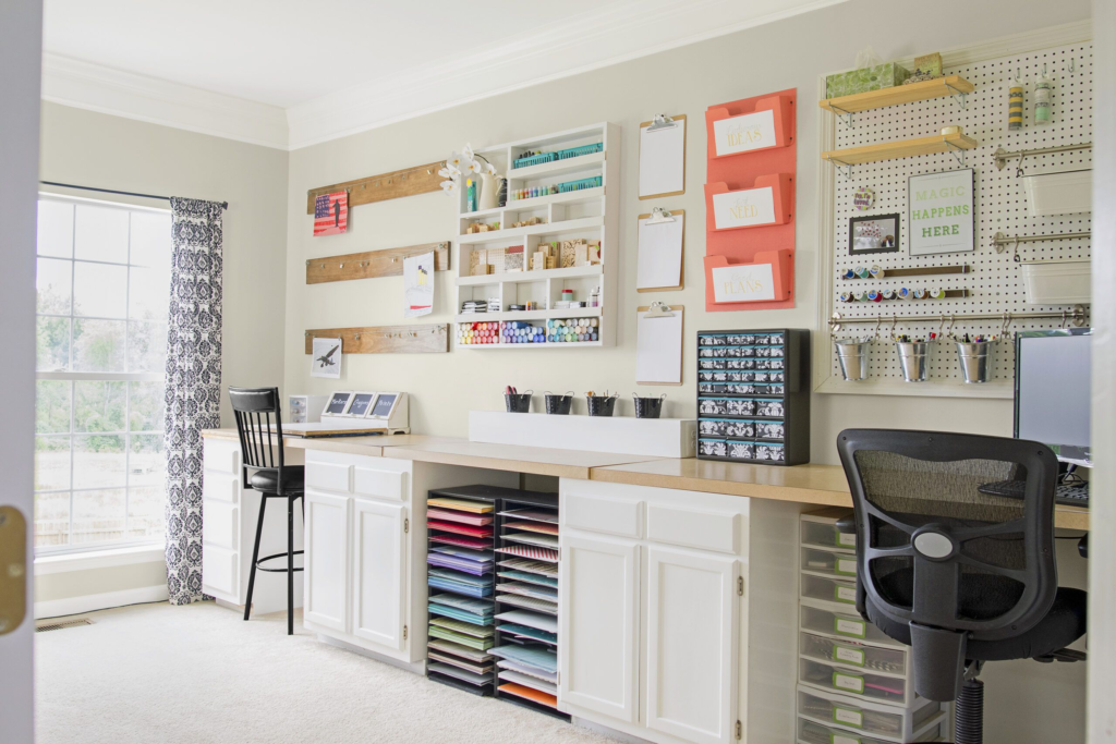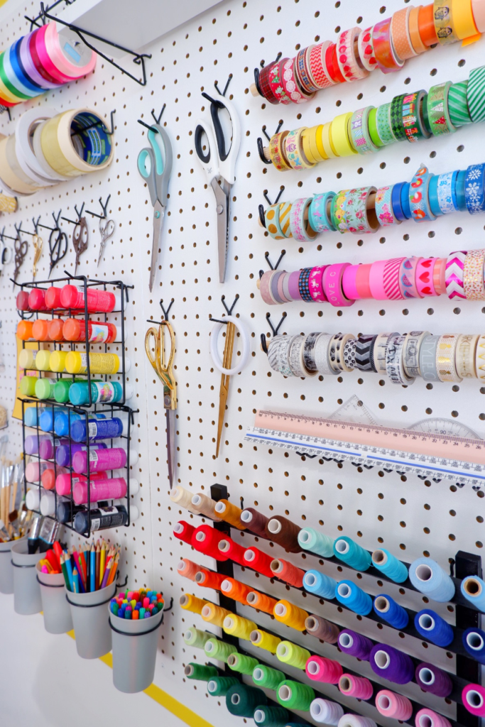 Si tenés poco espacio, las paredes pueden convertirse en grandes aliadas. Colgá estantes, ganchos o paneles perforados (los famosos pegboards) para colgar herramientas y materiales. Así no solo ahorrás espacio, sino que también le das un toque deco a tu rincón creativo.
